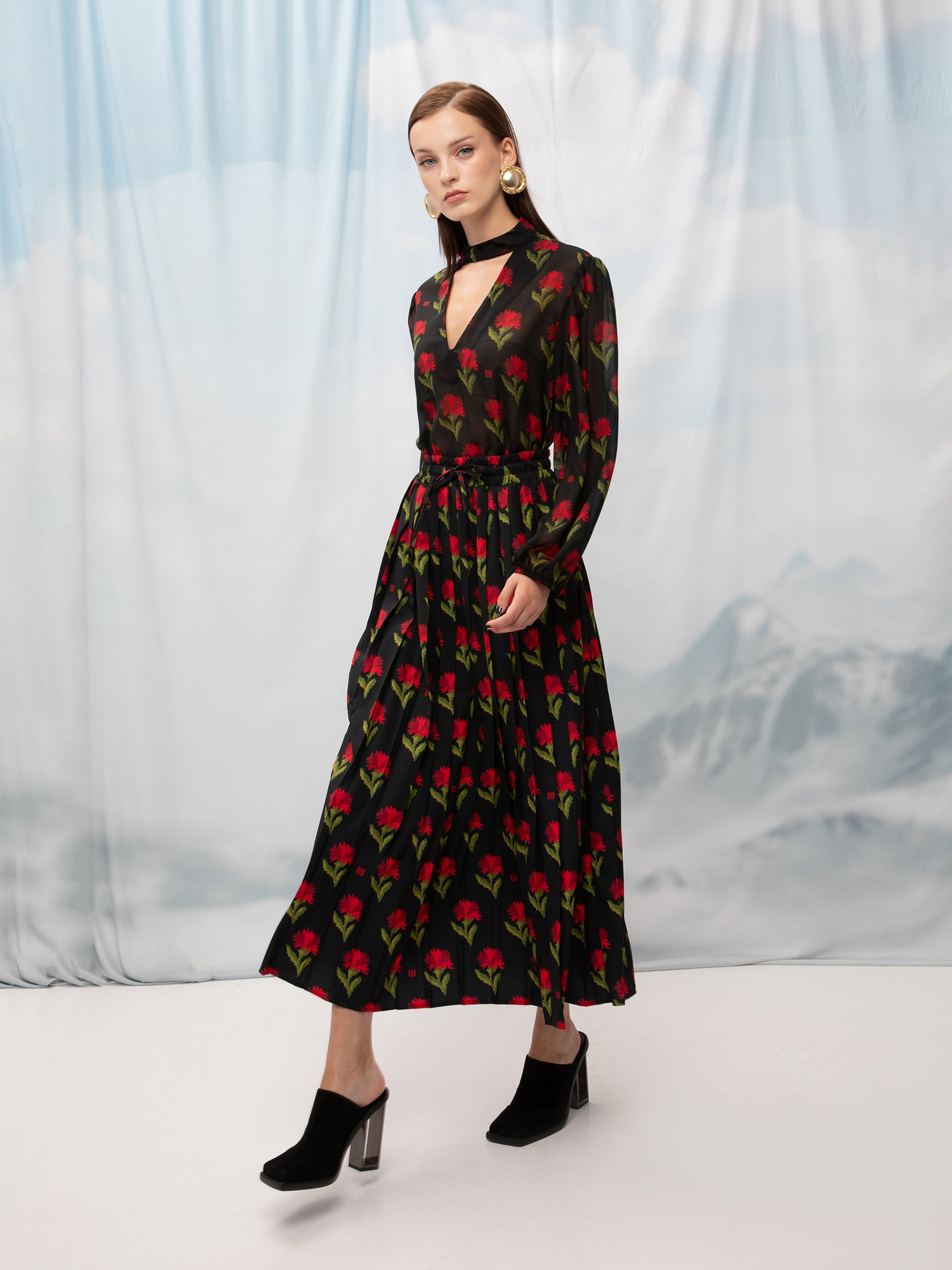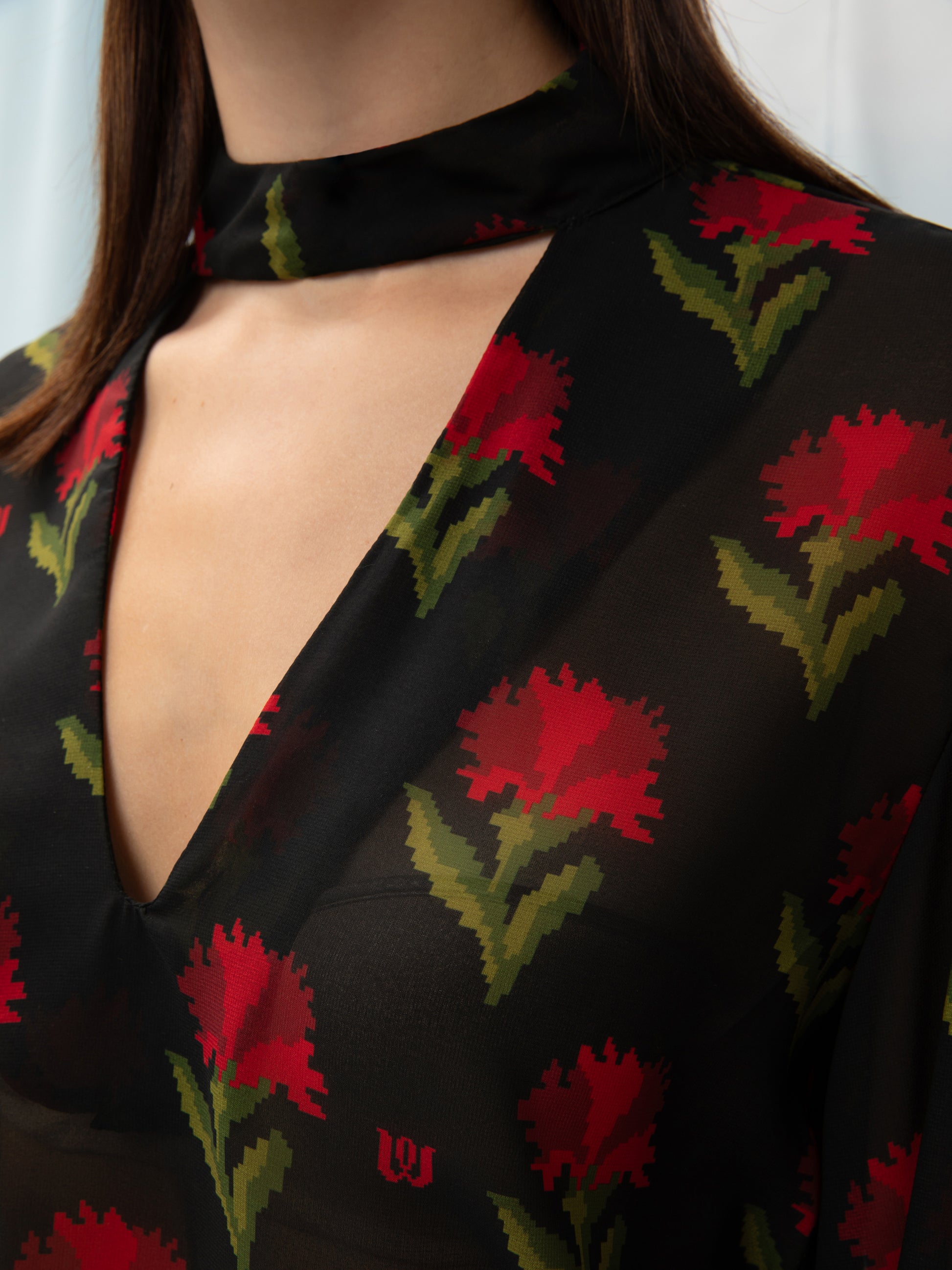 COWL-NECK CHIFON BLOUSE CARNATIONS BLACK