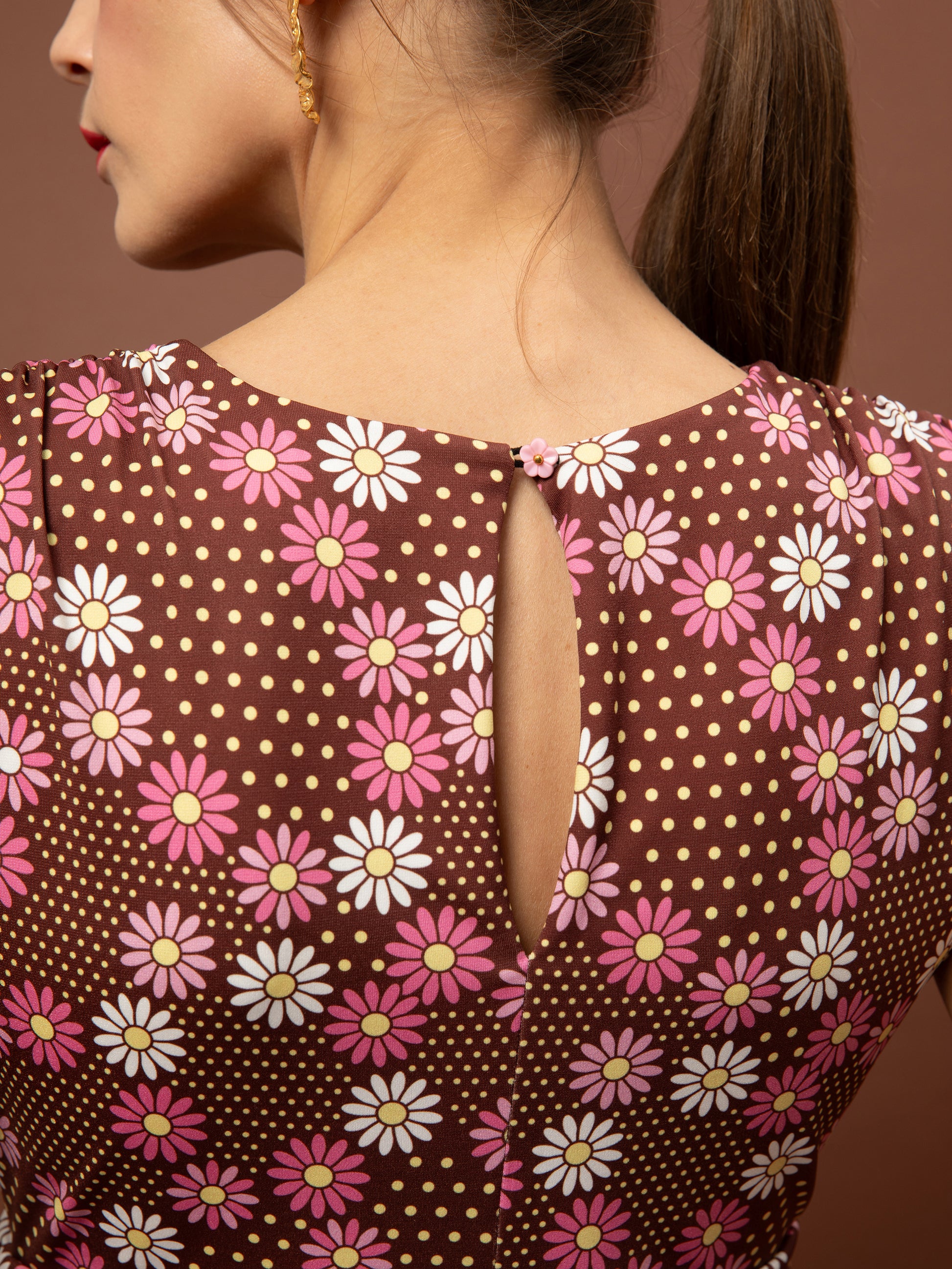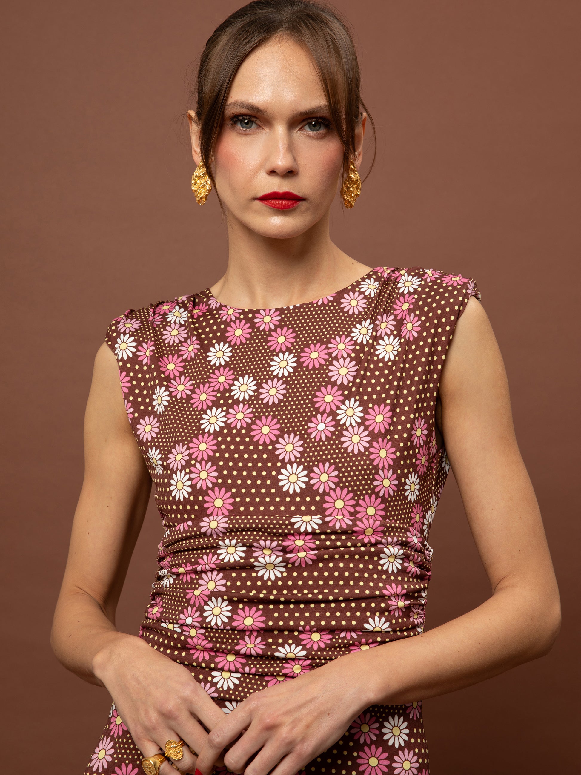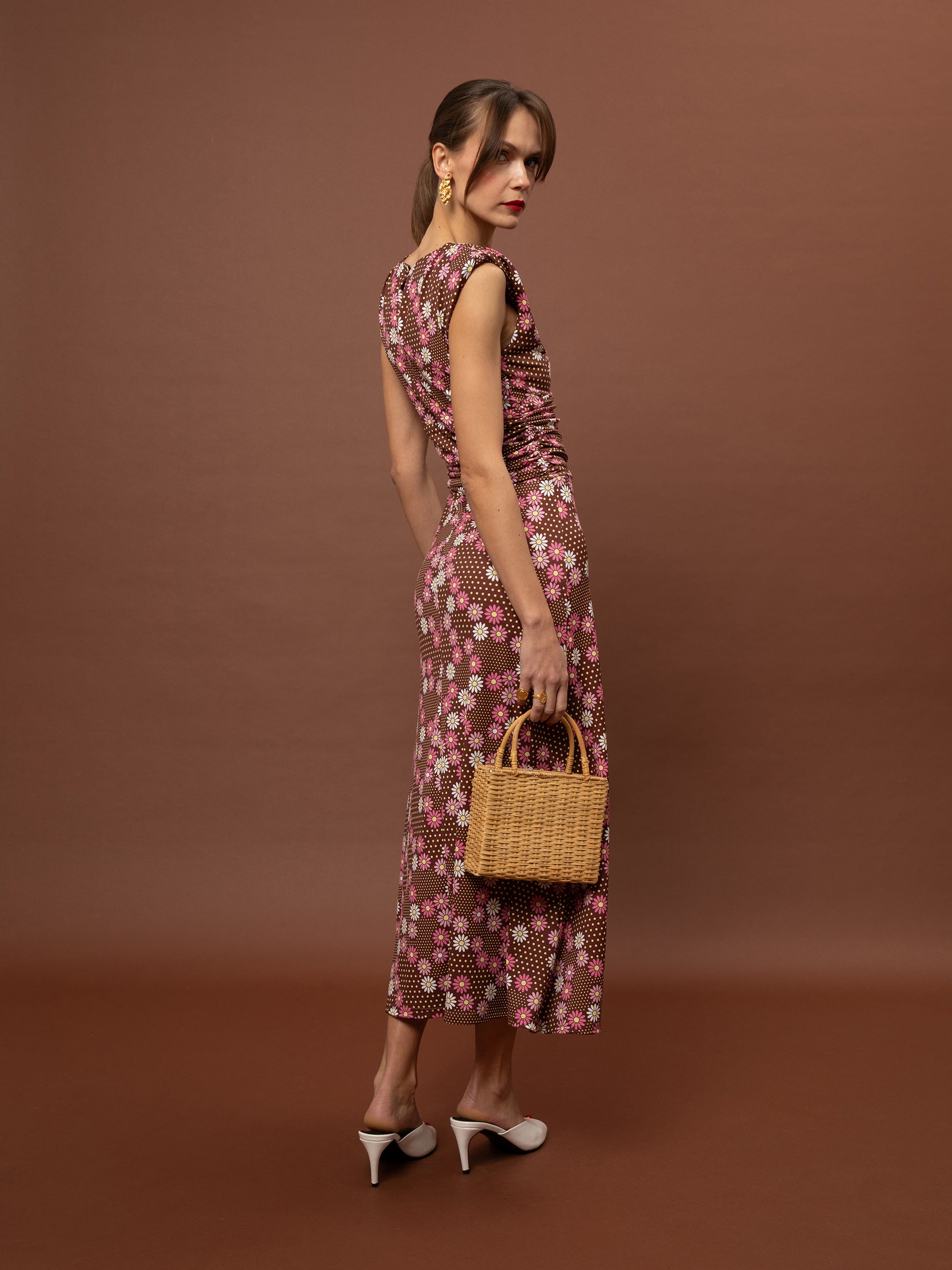 RUCHED JERSEY MAXI DRESS - DAISIES CHOCO