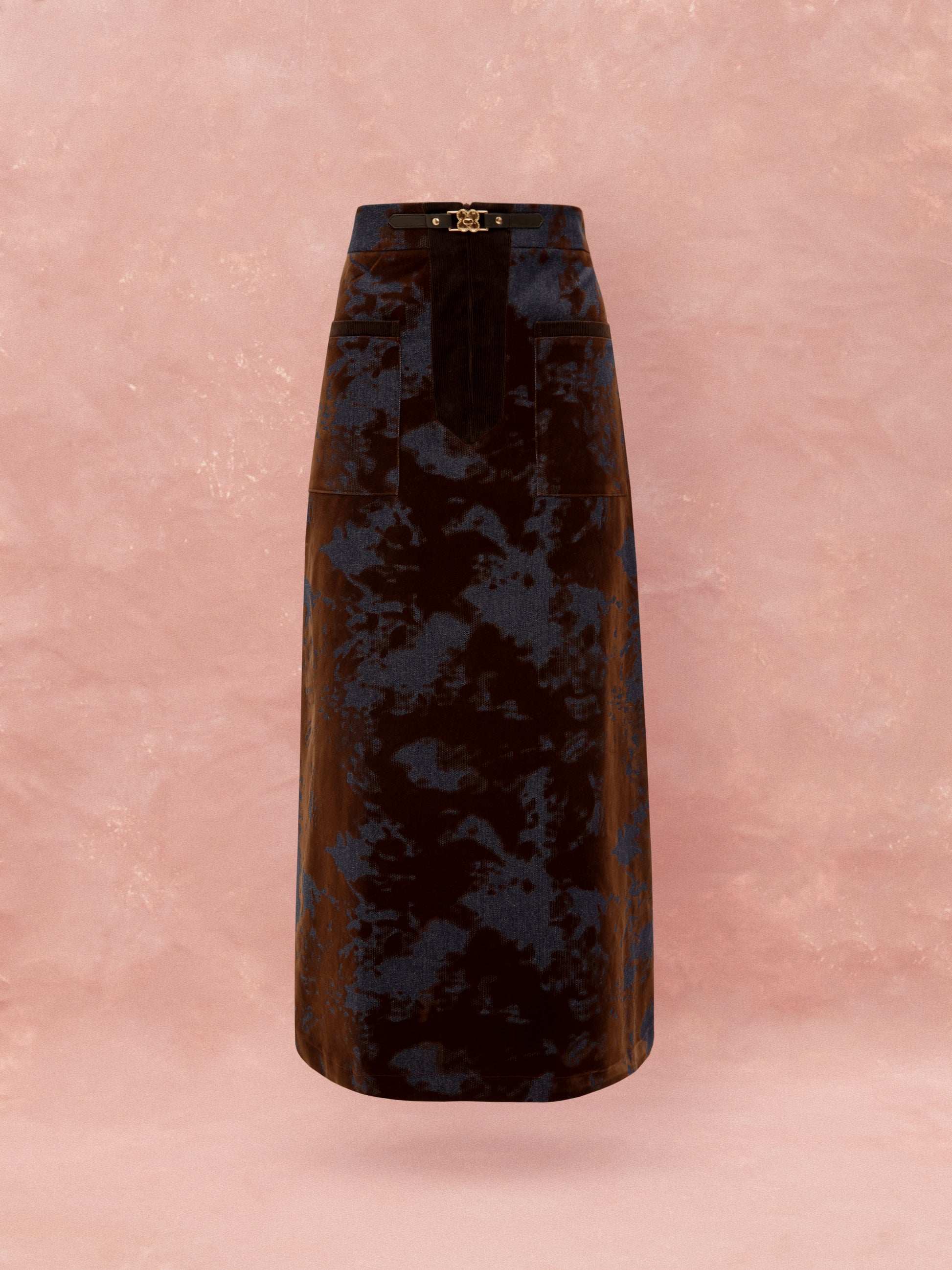 DENIM/VELVET STRAIGHT MIDI SKIRT - BROWN
