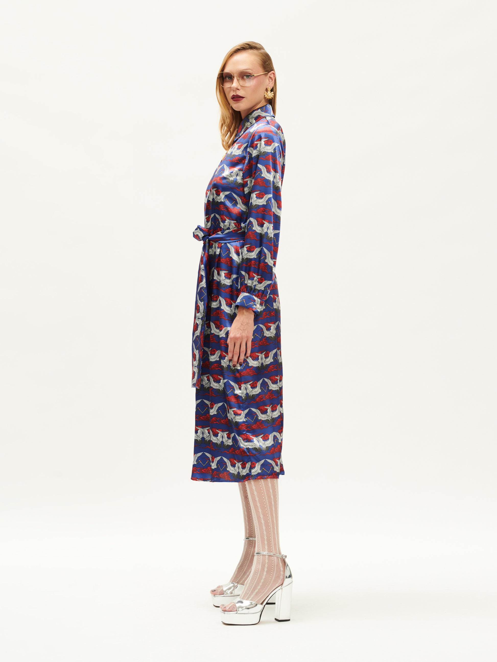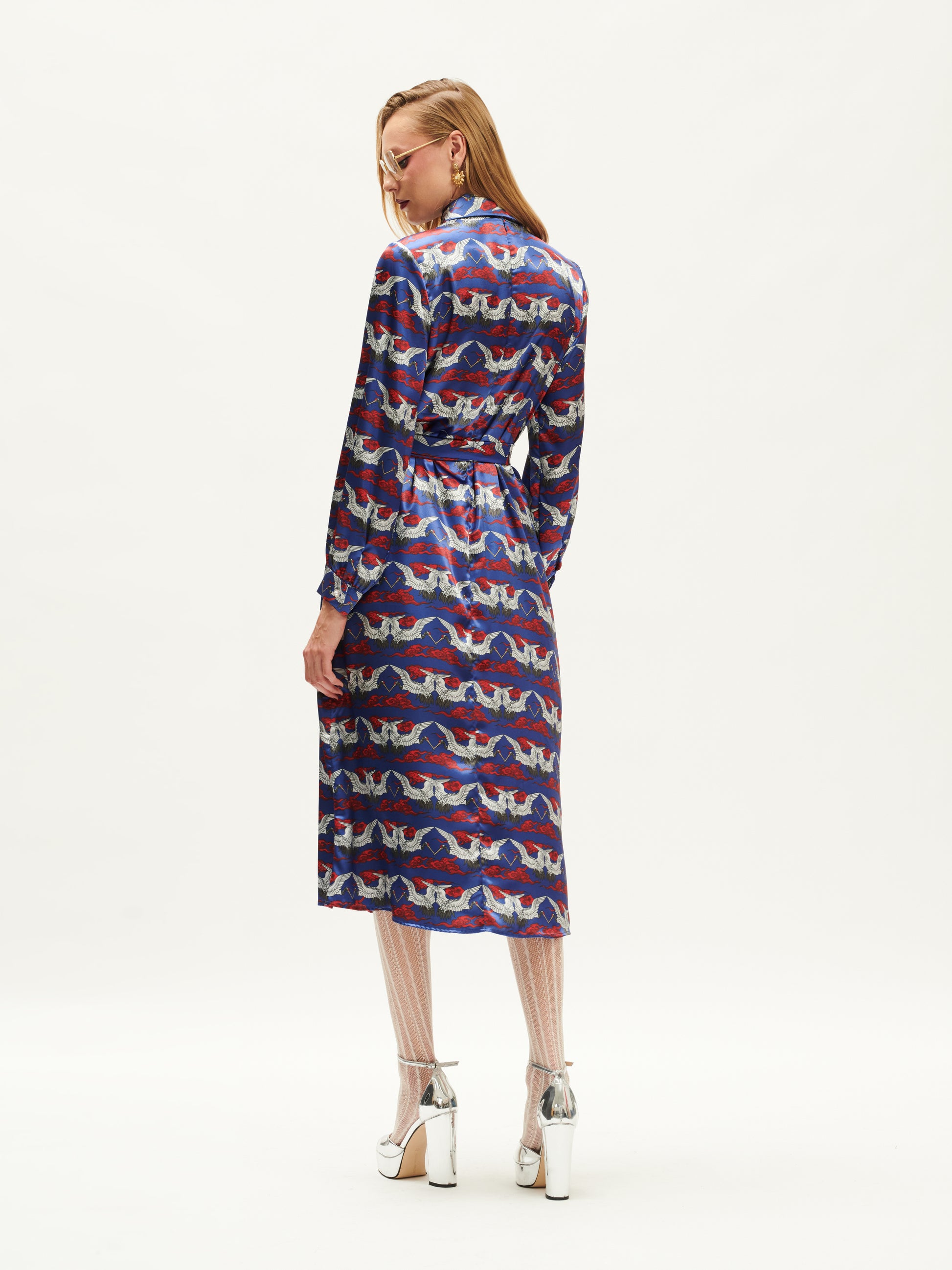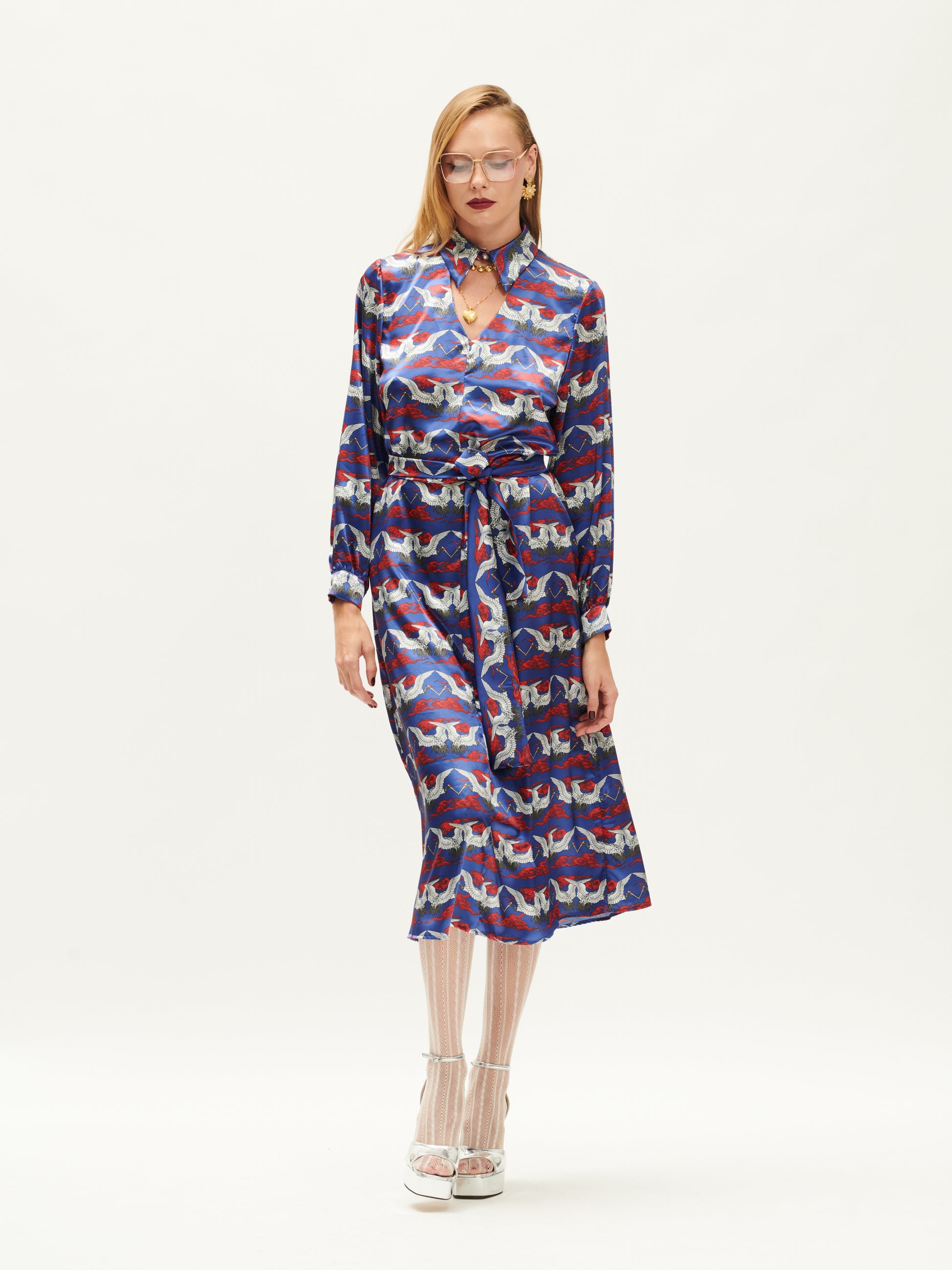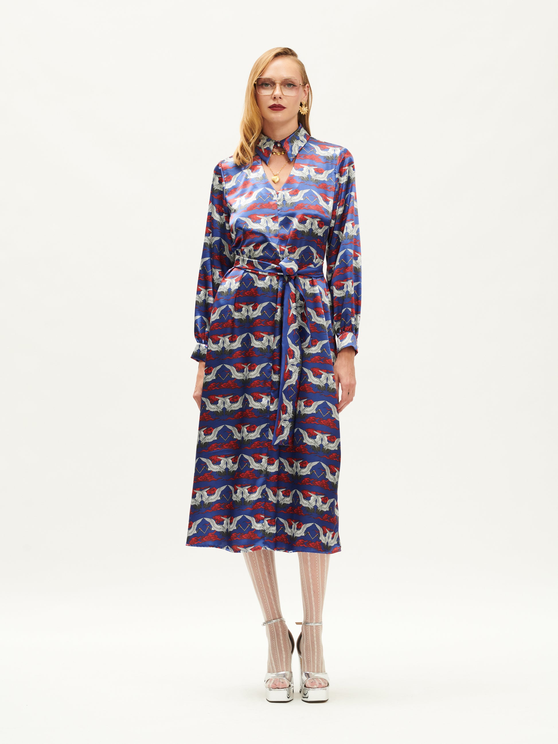 COLLAR-NECK MIDI DRESS CRANES INDIGO