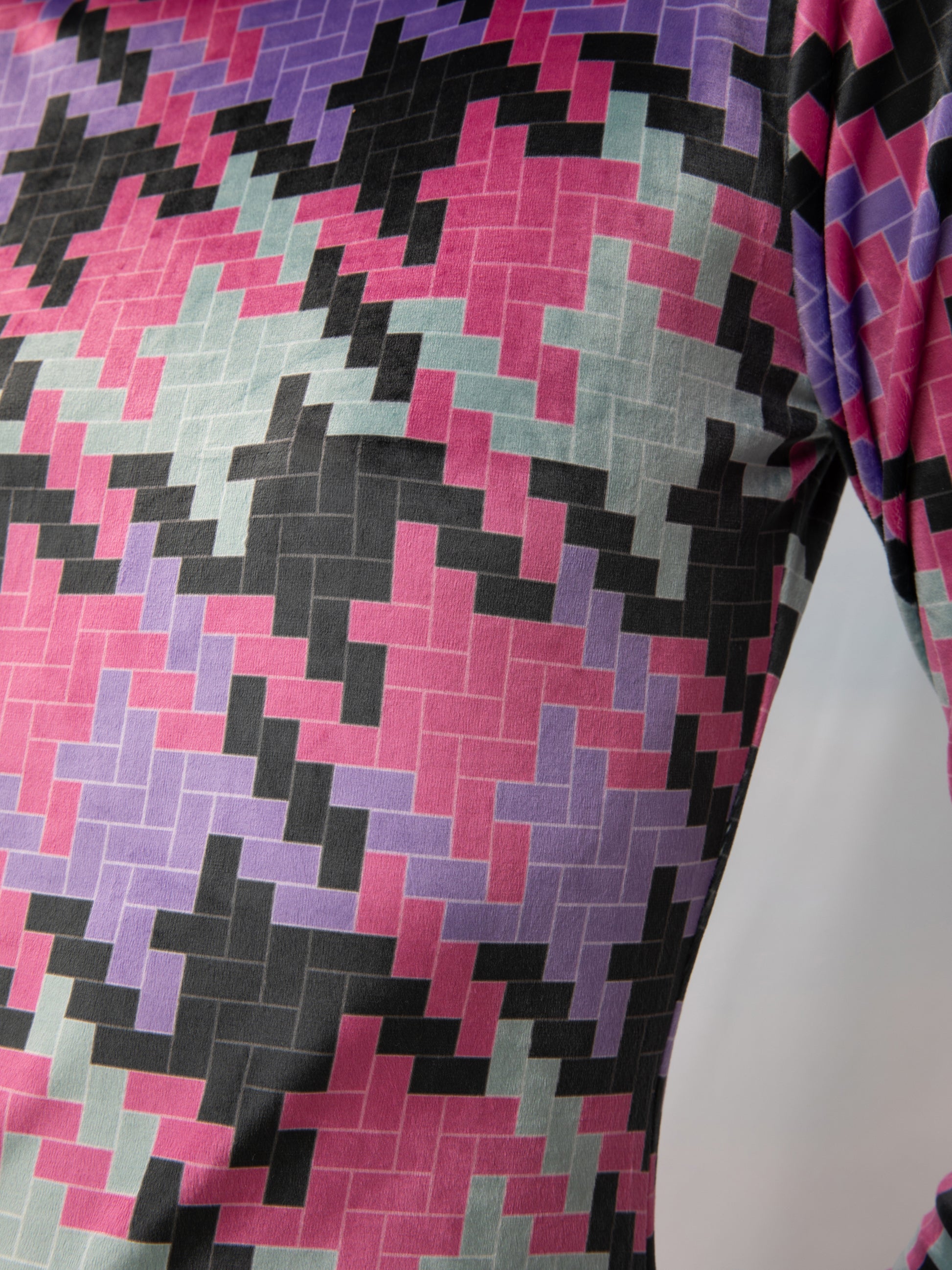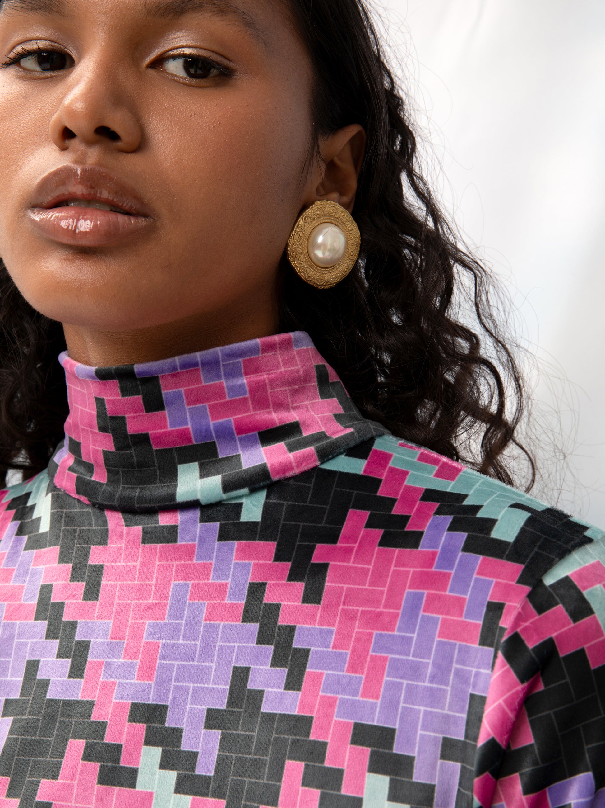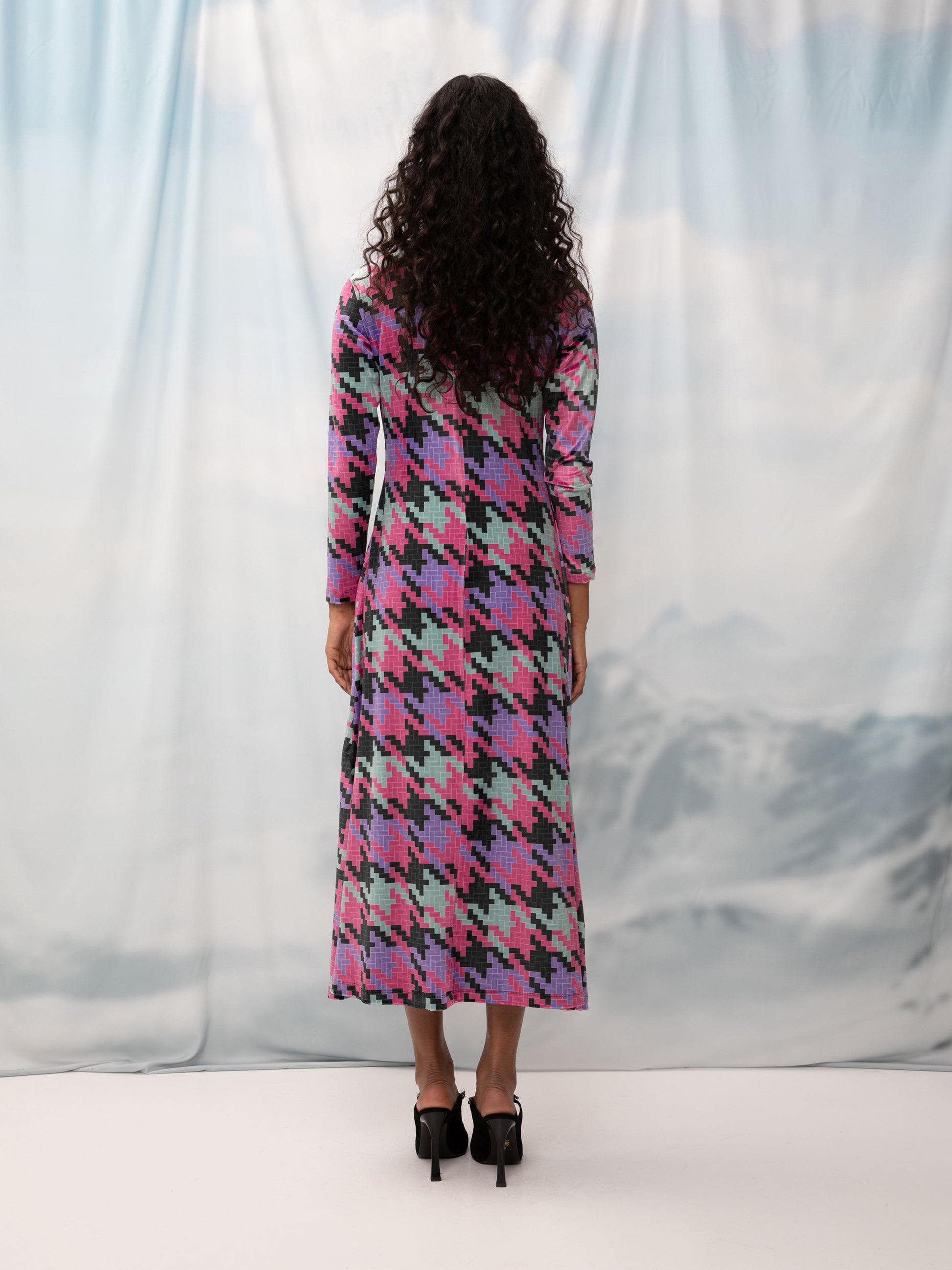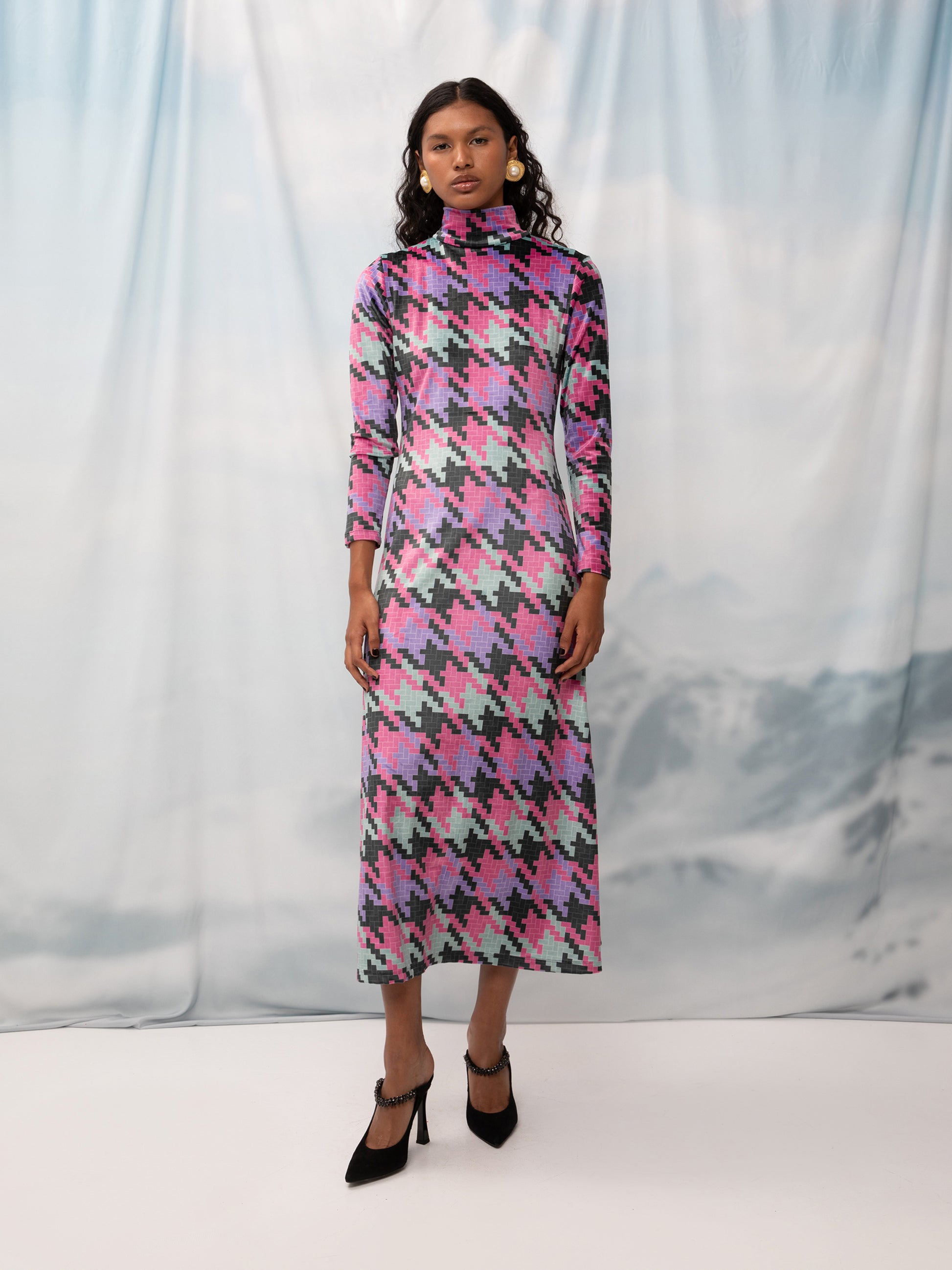 HIGH-NECK VELOUR DRESS PIED-DE-POULE