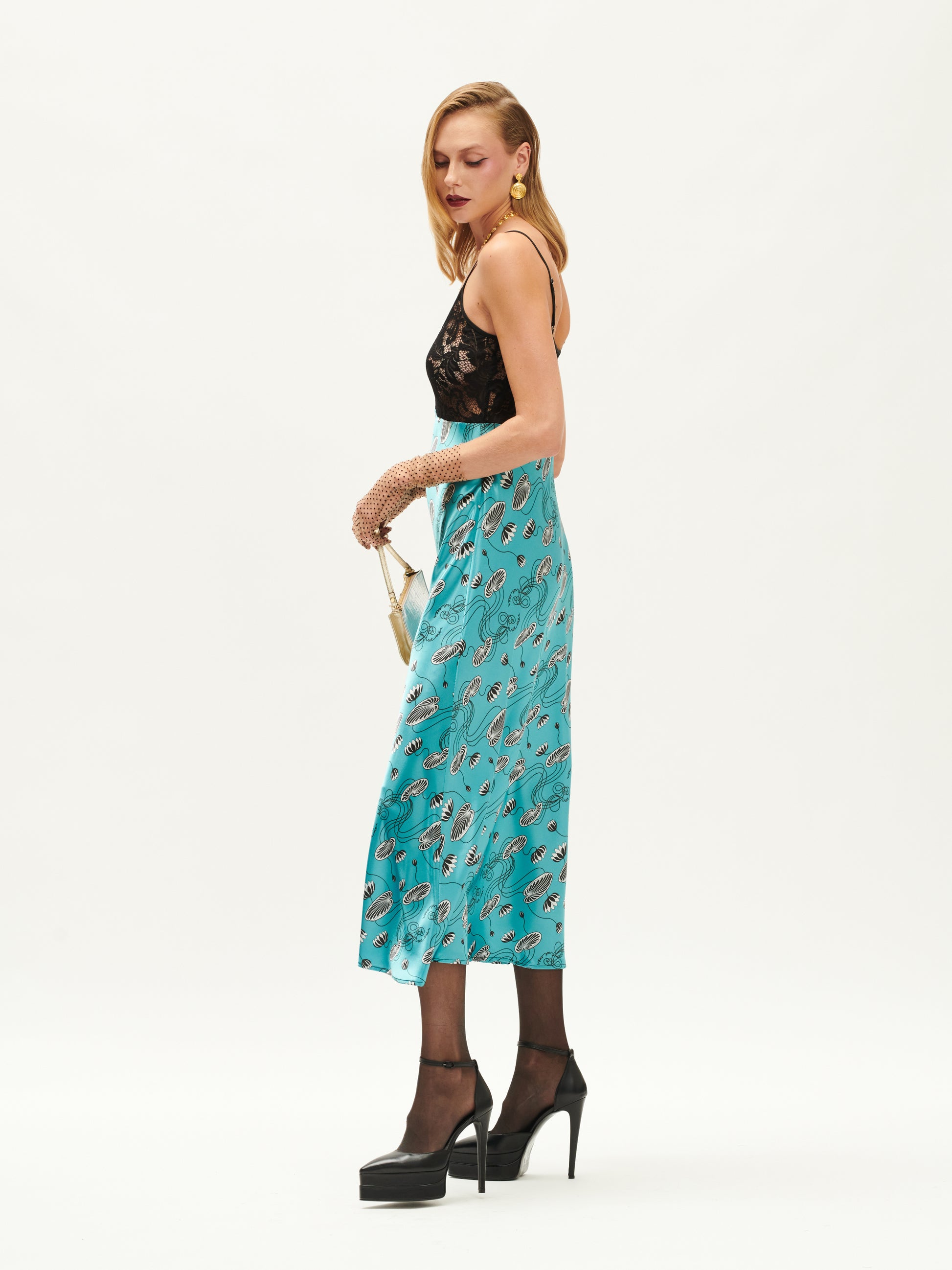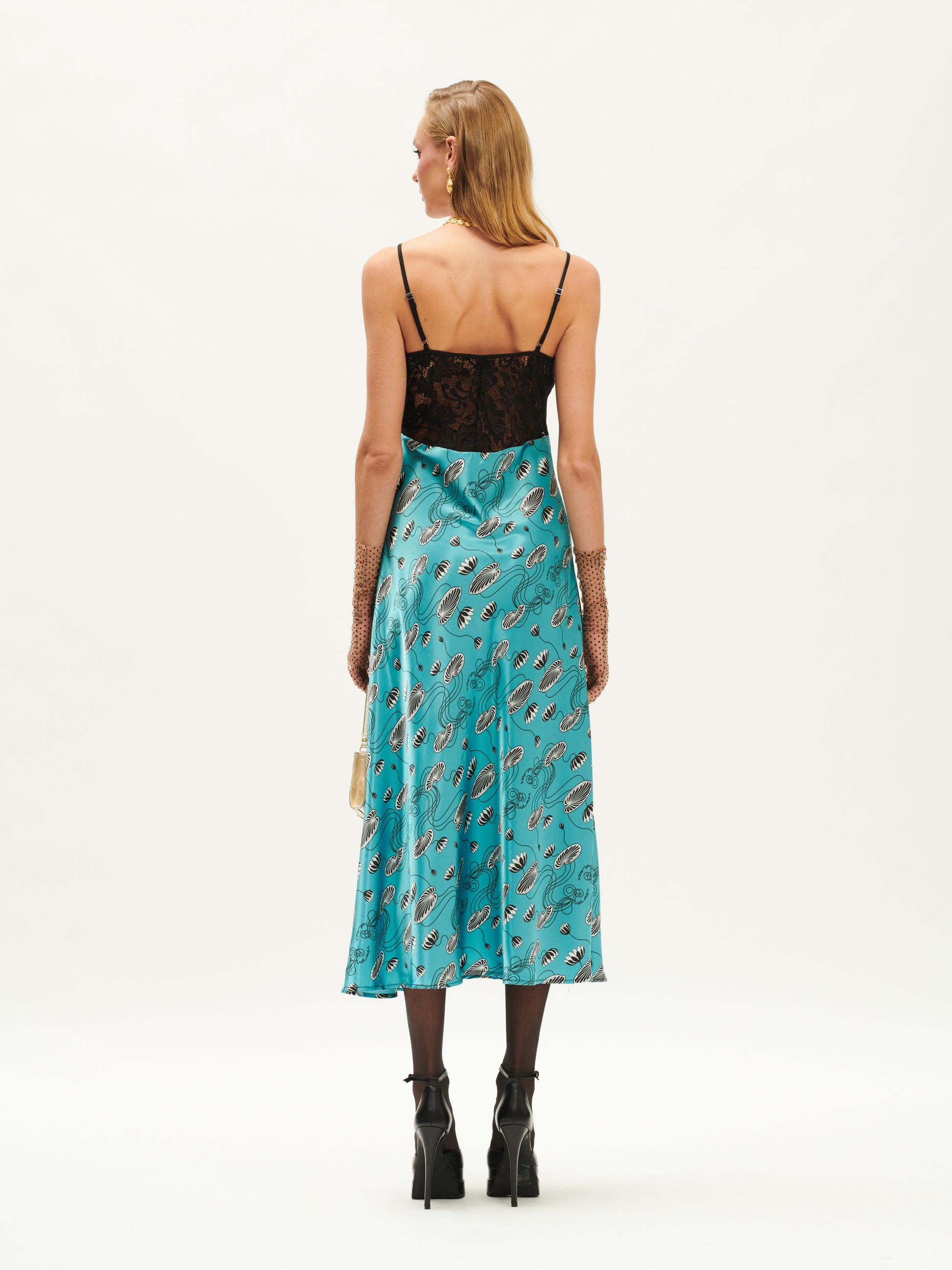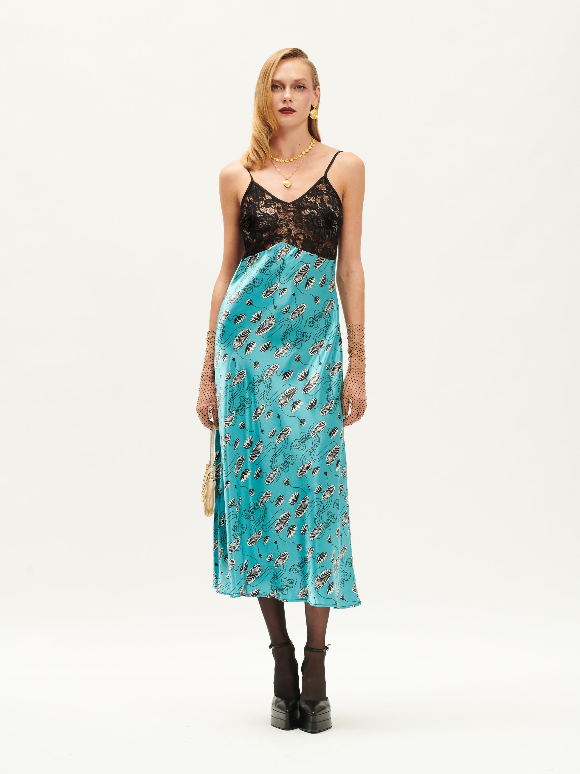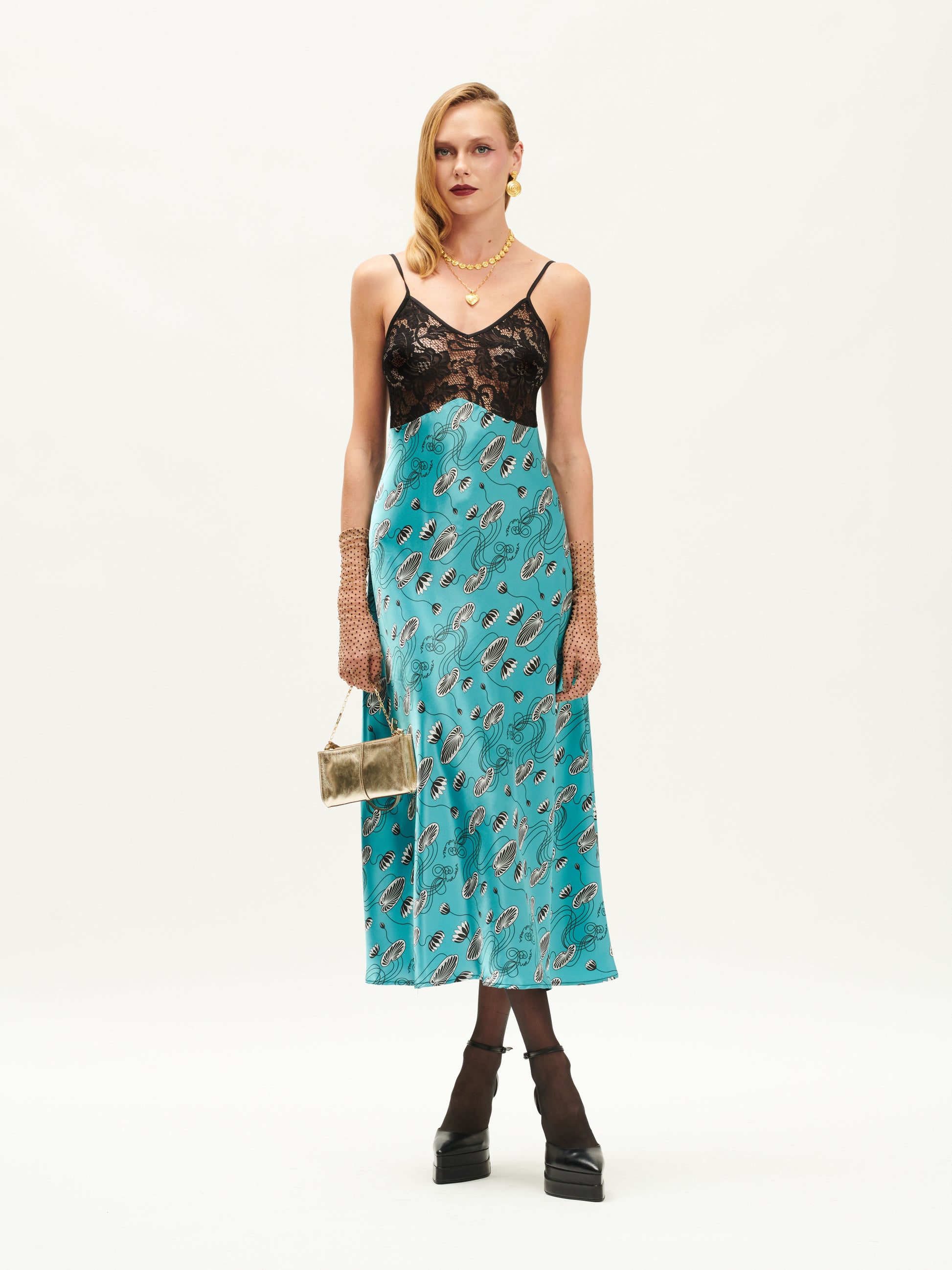 LACE-BUST SATIN MAXI SLIP DRESS WATERLILY TEAL