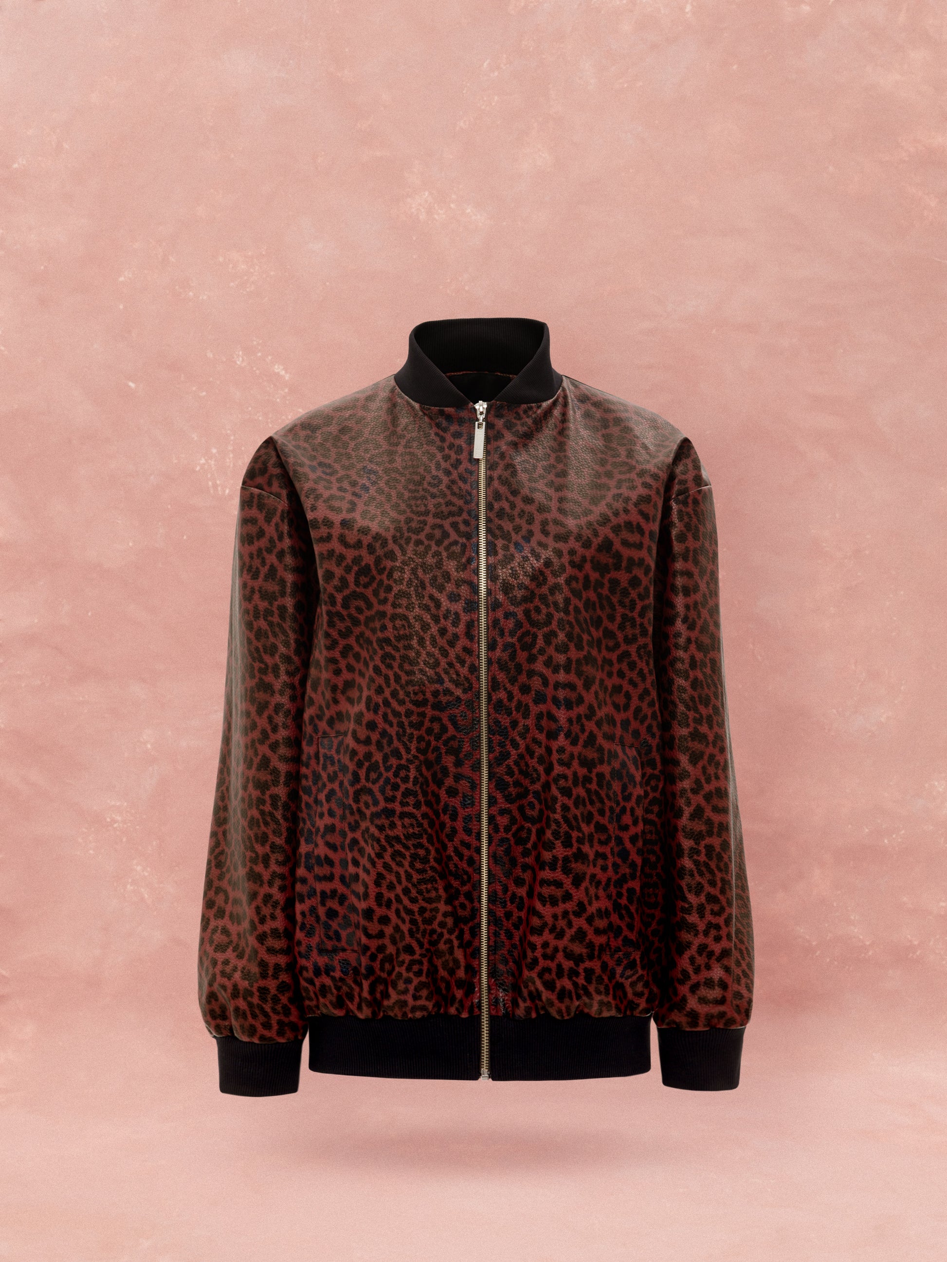 LEOPARD VEGAN-LEATHER BOMBER JACKET - BURGUNDY